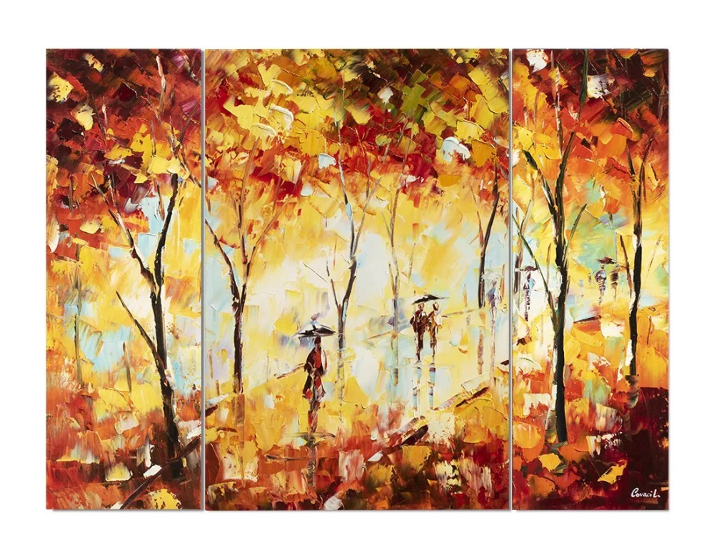 Set 3 piese tablou pictat manual, Plimbare relaxanta prin parc, 120x90cm ulei pe panza in cutit efect 3D