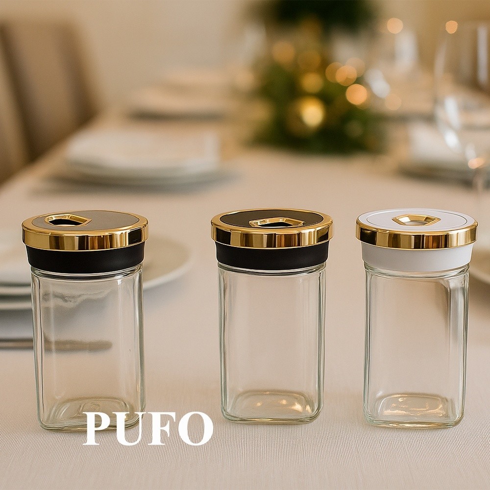 Set 3 recipiente din sticla Pufo Ellegant pentru sare, piper si condimente, 11 cm- practice si elegante