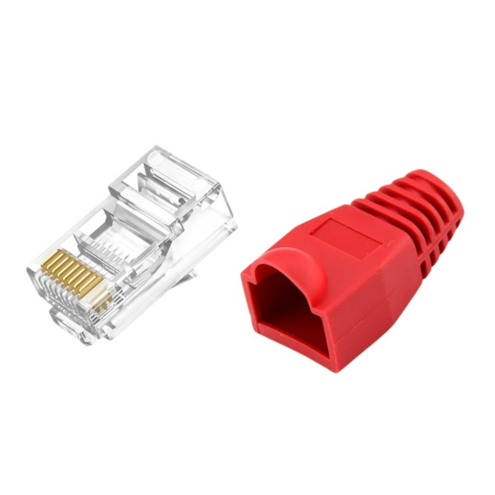 Set 30 x mufa + manson de protectie, RJ45, CAT5 CAT6, 8 pini 8P8C, rosu Conector retea RJ45 din plastic transparent pentru sertizarea cablurilor UTP si FTP de tip cat5 si cat5e. Caracteristici: • Utilizare de interior si exterior • Material: plastic Mansonul aplica peste cablurile LAN Ethernet mufate cu conector RJ45 Cat 5/5e sau 6. Este realizat pentru acoperirea conectorului RJ45 cu scopul de a asigura protectie si a intari baza legaturii cu cablul.