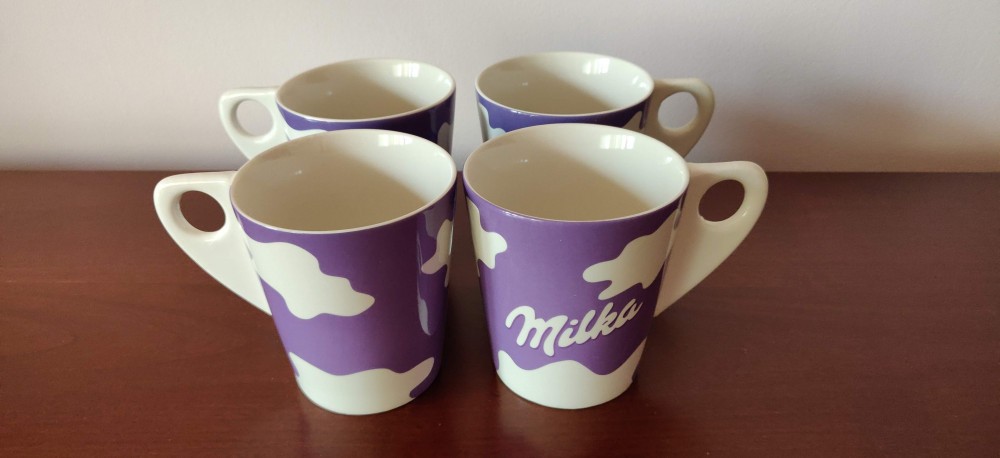 Set din 4 cani cu model adorabil cu pete mov de la Milka. Fiecare cana are capacitatea de 200 ml. Canile sunt in stare excelenta si cauta un nou proprietar.