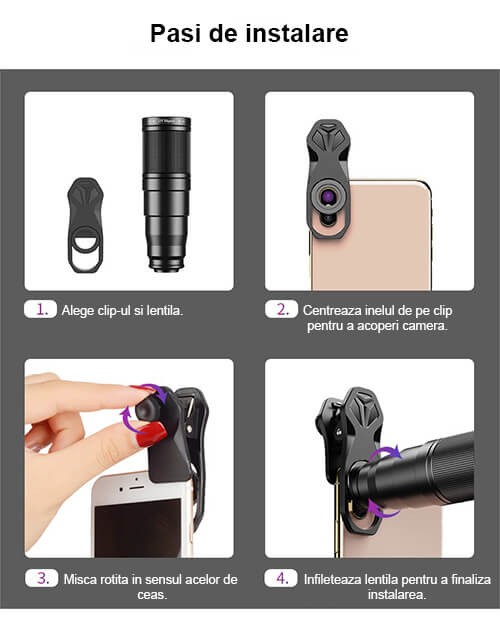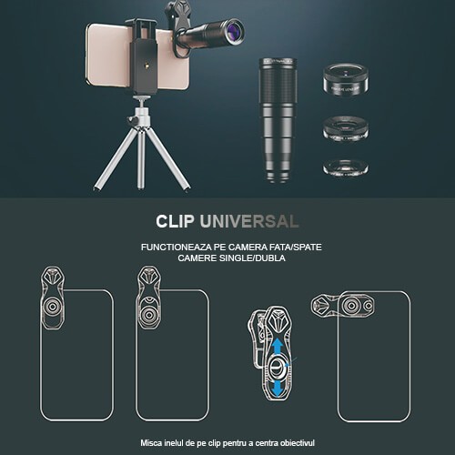 Obiectivul este fabricat din sticla optica de inalta calitate, astfel incat sa poti obtine imagini clare si netede fara distorsiuni sau abateri cromatice. De asemenea, obiectivul este usor de instalat si de utilizat, fiind echipat cu un suport pentru telefon si un invelis din cauciuc, pentru a proteja telefonul impotriva zgarieturilor sau a altor daune.