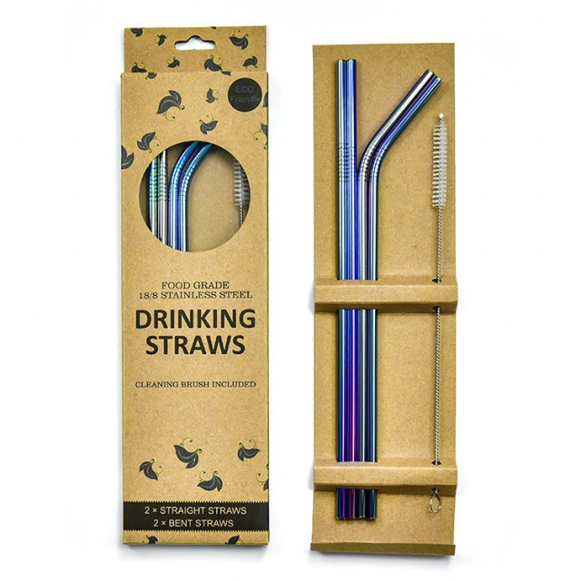 Set 4 paie reutilizabile din inox multicolor. Lungime 26.7 cm, diametru 6 mm; si periuta pentru curatare; 2 paie sunt drepte si 2 paie sunt cu capat indoit. Ambalate in cutie.