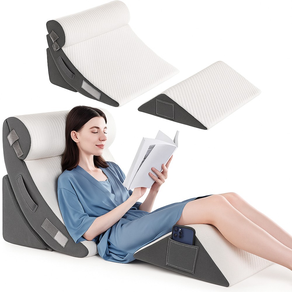 Multifuncționalitate: Setul include patru perne ajustabile, permițând alegerea unghiului ideal pentru a sta așezat, a te întinde sau a dormi. Acest lucru ajută la reducerea refluxului acid și îmbunătățirea calității somnului.