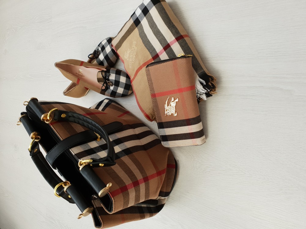 Set 4 piese Burberry : Portofel + Esarfa + Geanta + Balerini
