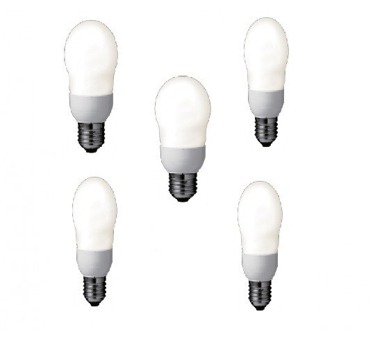 SET 5 becuri fluorescent Panasonic, soclu E27, putere 8W, forma oval, lumina alb calda, alimentare 220 - 240 V, "EFA8E27HD-5" (timbru verde 2.25 lei)