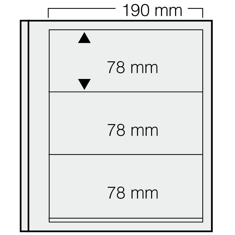 SAFE ALBUMS 613 PA Folii Dual System cu 3 buzunare de 78 x 190 mm Foi de carton cu Ph neutru si groase ofera un suport exceptional pentru timbre. Folii transparente, fara acizi chimici, cu 3 buzunare cu sudura speciala. Fiecare buzunar are o dimensiune de 78 x 190 mm. 14 perforatii - special concepute pentru albumele cu 14 inele din gama Favorit Dimensiuni: 270 x 297 mm Pachet de 5 pagini D-Blank.