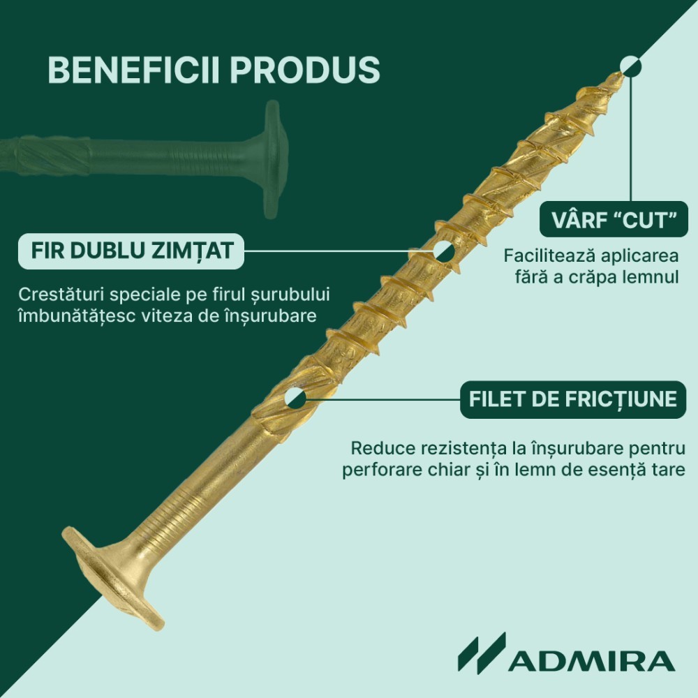Fir zimțat: Crestăturile speciale taie structura fibrelor din lemn, asigurând o înșurubare rapidă