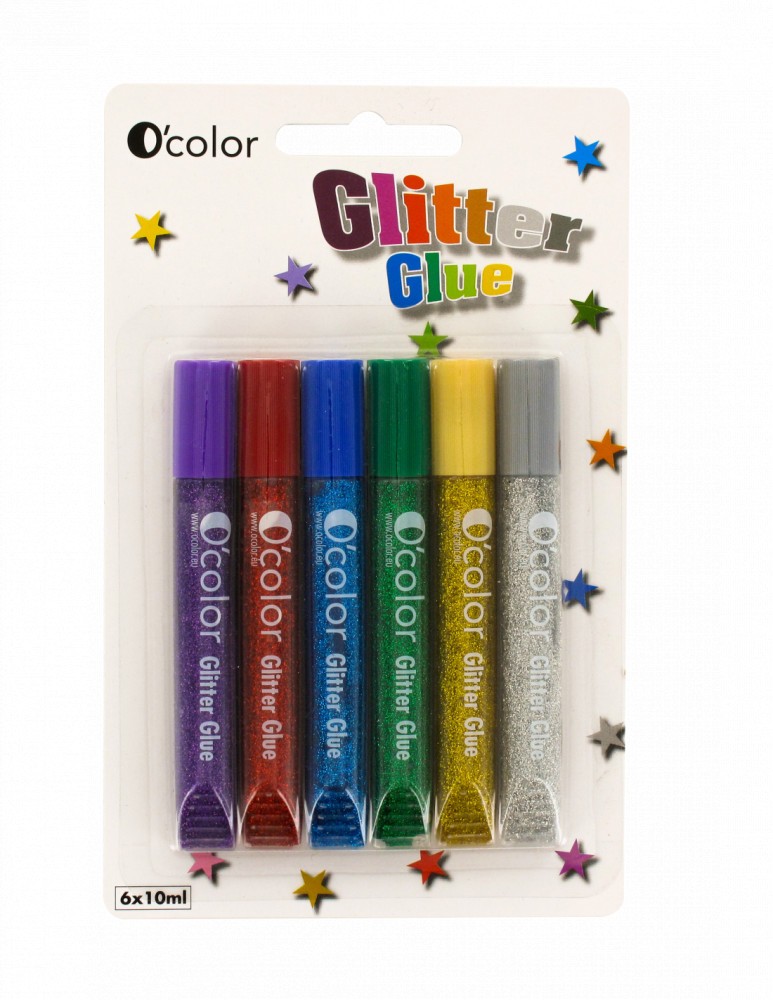 Setul contine 6 flacoane de lipici glitter colorat de 10 ml fiecare