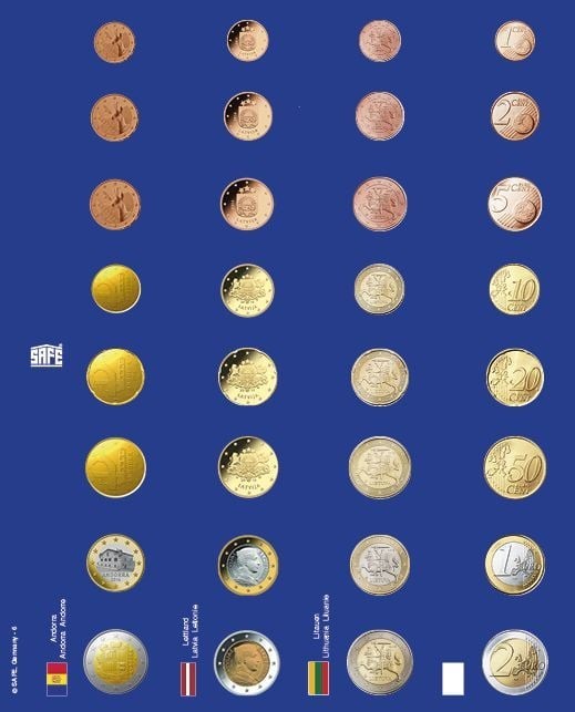 6 foi din carton albastru imprimat cu steagurile tarilor cu moneda euro. Fiecare foaie de carton are pre-imprimat 4 seturi de monede euro din 4 tari diferite. Aceste foi de carton sunt pentru seturile de monede euro in capsule. Seturi de monede euro de 1 cent, 2 cents, 5 cents, 10 cents, 20 cents, 50 cents, 1 euro, 2 euro. Pentru albumul cu folii blister pentru seturi de monede euro - TOPset 7817, , , , , , ,
