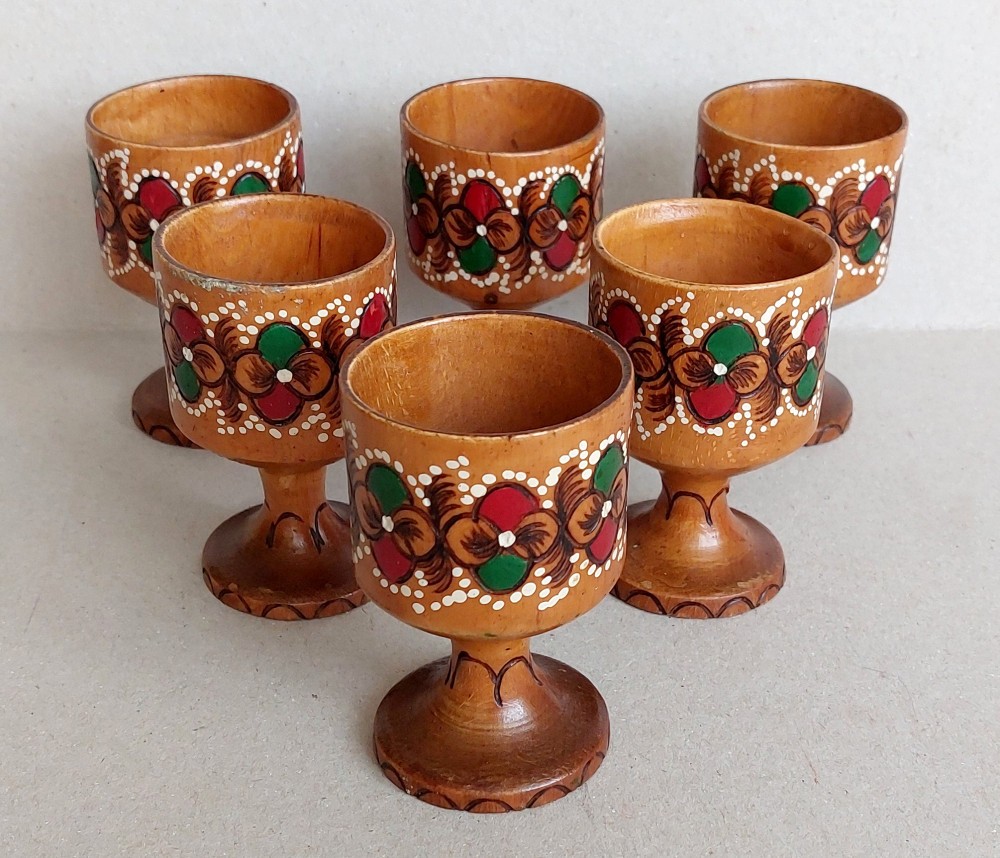 Set 6 paharele cu picior din lemn, pirogravate si pictate manual, inaltime 9,5cm