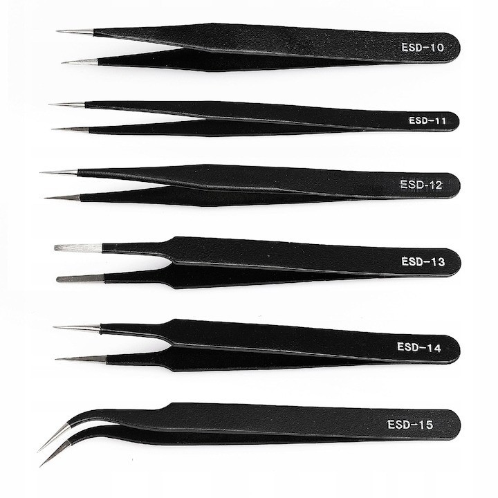 Set 6 pensete de precizie, antistatice, otel inoxidabil, negru Otel inoxidabil de inalta calitate Acest set de pensete de precizie este fabricat din otel inoxidabil de inalta rezistenta, cu vopsea antistatica nemagnetica pe suprafata si protectie pe baza de acid. Va rugam sa puneti tubul de protectie inapoi pe penseta ascutita pentru siguranta. Multifunctional Un set de 6 pensete pentru a se potrivi tuturor activitatilor in care aveti nevoie de precizie. Excelent pentru electronice, lucrari medicale si de laborator, bijuterii si alte mestesuguri fine. Manere sigure ESD Acest set de pensete cu finisaj ESD (Descarcare electrostatica de suprafata) sunt realizate pentru a proteja componentele si manerele de efectele daunatoare ale energiei statice. Confortabil Aceste pensete va permit utilizarea pe o durata indelungata de timp datorita liniilor netede si procesare fina. Setul include: ESD-10 (drept - 10,5 cm) ESD-11 (drept - 13 cm) ESD-12 (drept - 11 cm) ESD-13 (drept - 11 cm) ESD-14 (drept - 11,5 cm) ESD-15 (oblic - 10,5 cm)
