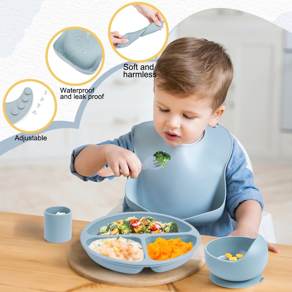 Set 6 piese hranire bebelusi, diversificare, silicon, baveta, farfurie, bol cu ventuza, lingurita si furculita