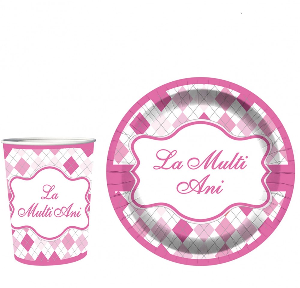 Set 8 pahare 8.5 cm, 175 ml si 8 farfurii de carton, 18 cm, Roz Model