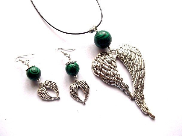 Set aripi ingerasi ,pandantiv si cercei cu malachit( pietre