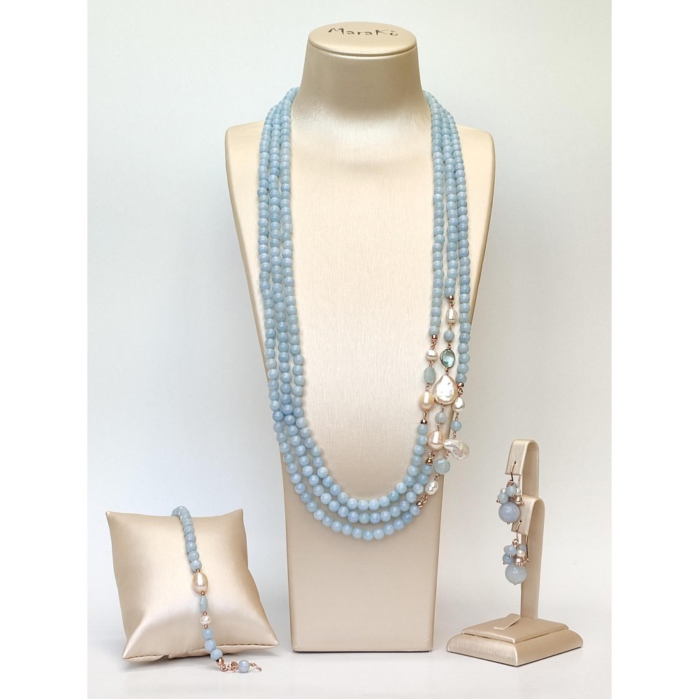Set Armonia din acvamarin și perle de cultură, compus din: colier, brățară și cercei . Colier din acvamarin și perle de cultură. Lungime: 73 cm. Cercei din acvamarin și perle de cultură, cu sfera mare de 12 mm. Lungime: aproximativ 3.5 cm. Brățară din acvamarin și perle de cultură, cu sfere de 6 mm. Dimensiune: 18 - 23 cm, reglabilă. Detalii produs: Argint925/°°° placat cu aur roz, cu tratament antioxidant unic. Certificat de garanție a materialului. Cutie și pungă cadou incluse. Fiecare bijuterie este realizată manual, cu precizia inconfundabilă Made in Italy. Notă: Pot exista mici diferențe față de imaginea produsului, deoarece fiecare bijuterie este realizată manual, iar perlele sunt neuniforme. Culorile pietrelor semiprețioase poti fi diferi în funcție de reflexia luminii.
