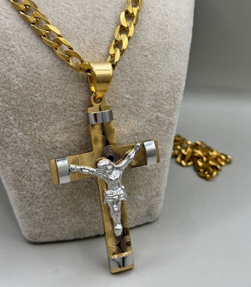 Un set impunător și elegant, creat pentru bărbatul care apreciază stilul puternic și simbolurile spirituale. Acest set din inox placat cu aur include un lanț Cuban de 7 mm grosime și un pandantiv masiv în formă de cruce cu Iisus răstignit, realizat în detaliu 3D cu accente argintii și aurii.