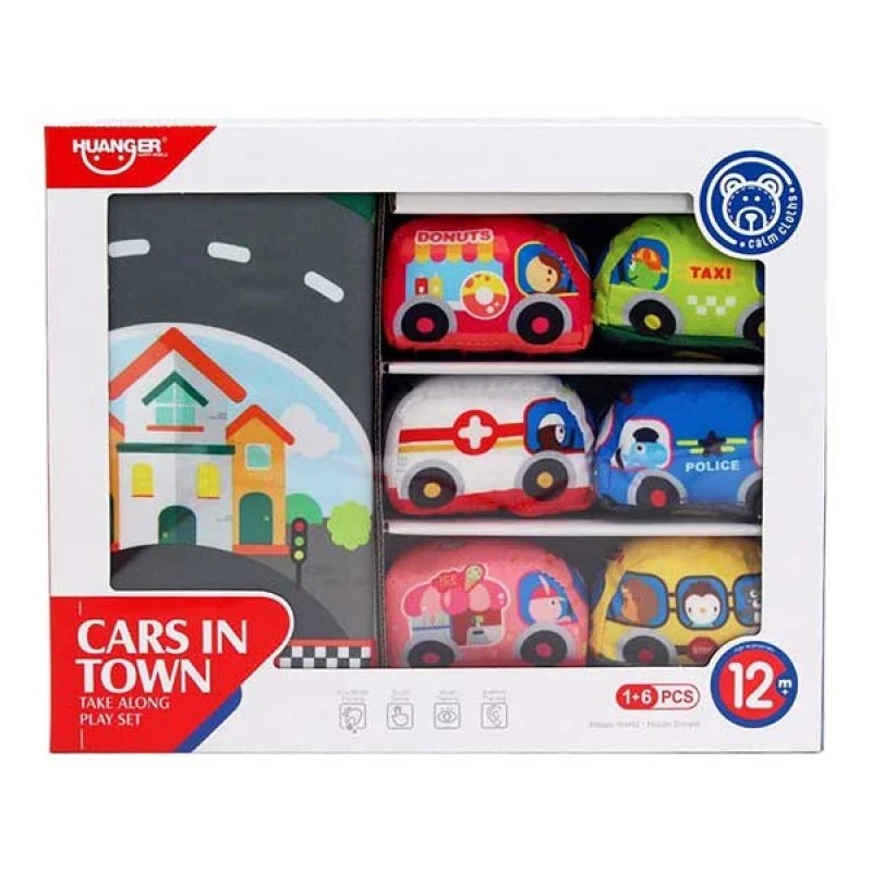 Set de joaca pentru bebelusi Distractia este garantata iar bebelusul tau va fi captivat de aceste masini de jucarie de plus! Setul include 6 masinute (ambulanta, masina de politie, taxi, autobuz scolar, masina de inghetata si masina cu gogosi) si un covor de joaca /gentuta de depozitare. Masinutele sunt fabricate din plus, sunt colorate, moi, acoperite cu panza. Covorul se pliaza usor fiind din material moale, are manere pentru a fi transportat. Atrageti atentia: 3 dintre masini au clopotei si va suna cand copiii scutura masina. Alte 3 dintre masini scot zgomote cand bebelusul le ciupeste. Jucariile sunt frumos colorate si modelele indragite de copii. Nu contin roti sau alte accesorii mici, astfel ca jocul este sigur pentru bebelusi.