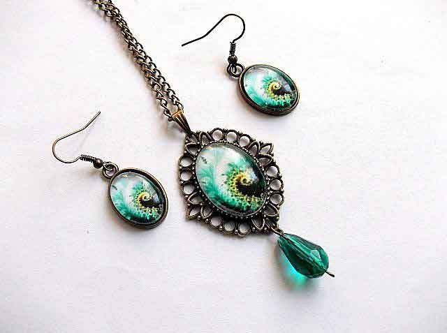 Set bijuterii design abstract verde, galben si negru, set pandantiv si cercei 33165. Cadou femei – set bijuterii, metal, sticla si cristale fatetate de culoare verde, colier cu pandantiv si cercei cu un design abstract.