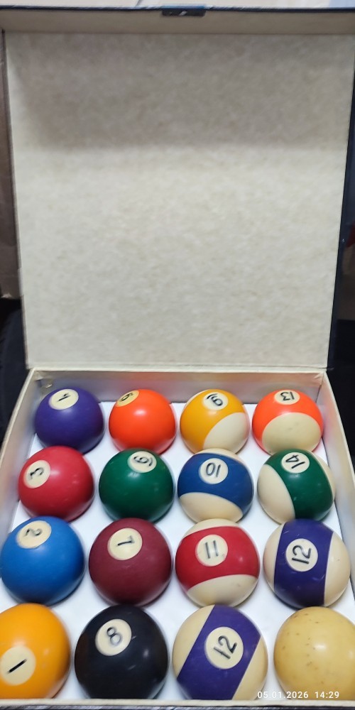 Set bile de biliard. Prezintă semne de uzură. Lipsește bila 15