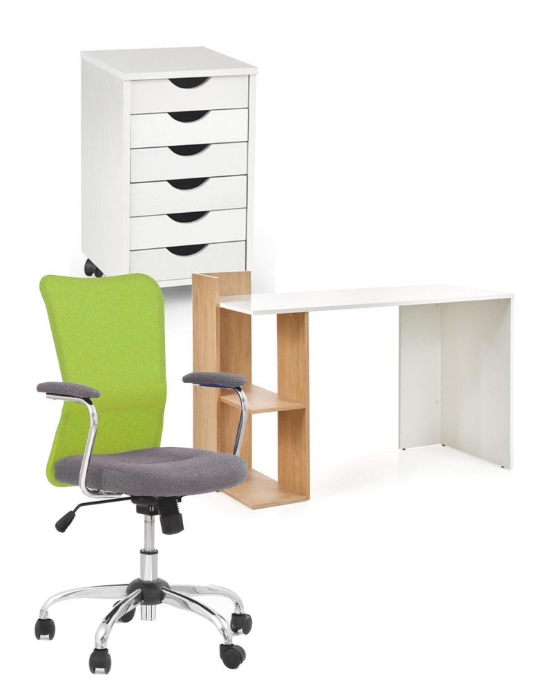 Set birou copii HM Fino, PAL Melaminat, rafturi, stejar auriu alb cu scaun HM Andy verde, mesh, 102 kg si dulapior rulant HM Simon 2, cu roti, front M