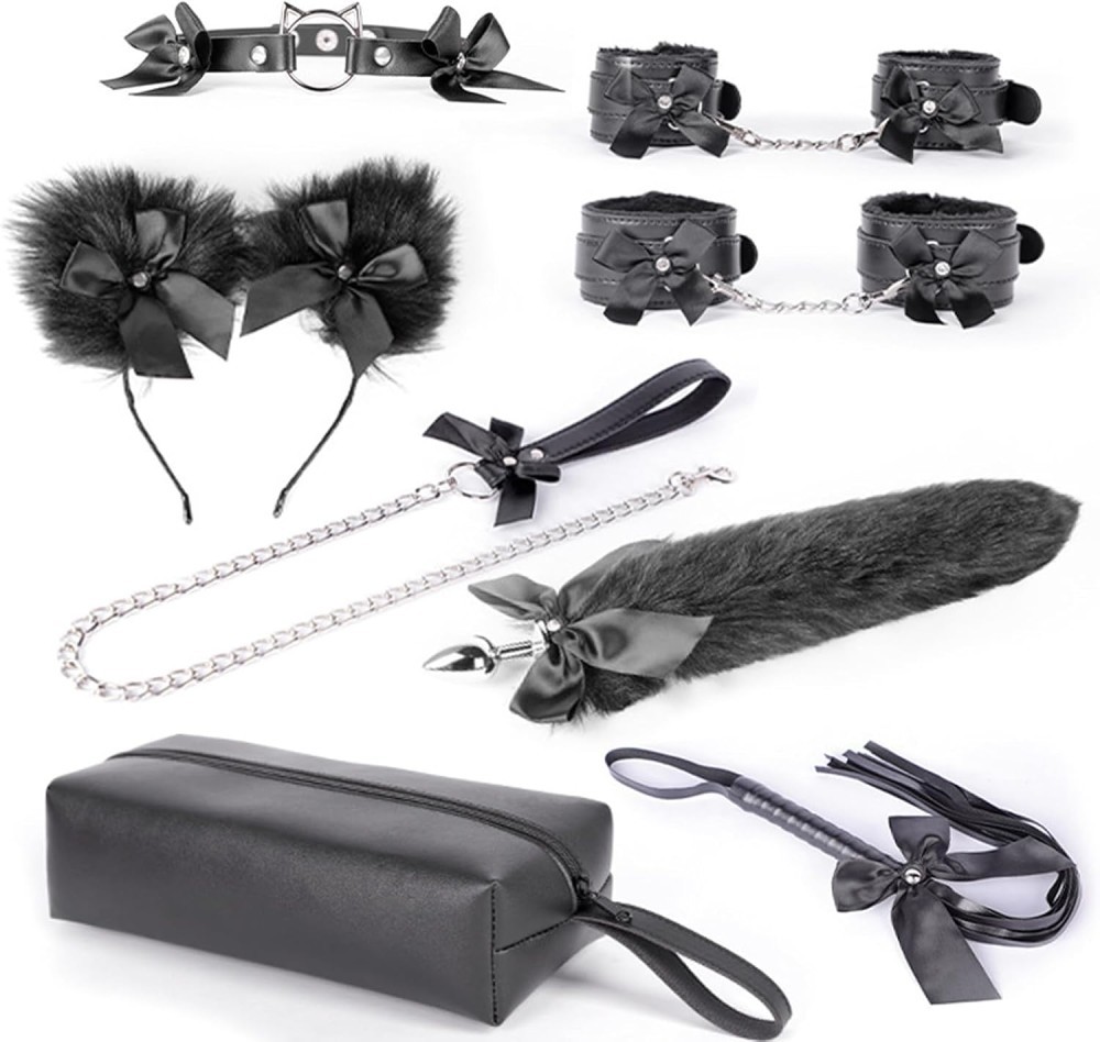 Set format din 8 accesorii bondage, realizate intr-un design jucaus dar totodata atractiv din materiale de inalta calitate ce se simt extrem de placut in contact cu pielea. Aspectul general duce cu gandul la un costum de pisica, anumite accesorii avand prezente in componenta lor detaliile specifice ale acestui animalut domestic. Mai exact, cateva accesorii includ blana artificiala prezenta sub forma de urechiuse si codita iar alte accesorii au inel in forma asemanatoare unui cap de pisica. Totodata, pe toate accesoriile incluse in set sunt prezente funde satinate senzuale, ceea ce ofera un aspect atractiv si special. Articolele sunt ambalate int-o cutie eleganta si extrem de practica care va permite o depozitare cat mai eficienta si sigura a lor. Aceasta este de tip borseta, include bucla pentru depozitare si este asortata perfect cu accesoriile incluse in set. Kitul include multiple accesorii cum ar fi catuse pentru incheietura mainii, catuse pentru glezne, bentita, bici, dildo anal si zgarda cu lesa. Acestea dispun de inchidere pe baza de catarama metalica argintie/capse, ceea ce permite ajustarea in functie de circumferinta fiecarei zone pe care urmeaza a fi aplicate. Biciul inclus in set se poate utiliza cu usurinta, avand maner spiralat si bucla lata pentru o depozitare cat mai eficienta. Modelul dispune de multiple cozi subtiri si este perfect atat pentru jocurile mai intense de spanking, cat si pentru cele de intensitate usoara. Pentru un plus de senzatie, setul include si un dildo anal metalic ce are varf ascutit si forma progresiva, astfel incat poate fi folosit atat de incepatori, cat si de catre cei avansati in folosirea jucariilor erotice. In continuarea lui este prezenta o coada densa din blana artificiala, ceea ce ofera un aspect deosebit si atractiv. Astfel, setul este unul complex ce se poate face cadou partenerului de cuplu pentru a aduce un plus de noutate si senzatie in viata intima. Totodata, se poate face cadou unei persoane apropiate din viata dumneavoastra, daca sunteti o persoana mai indrazneata si fara inhibitii. | Material: Poliuretan | Culoare: Negru