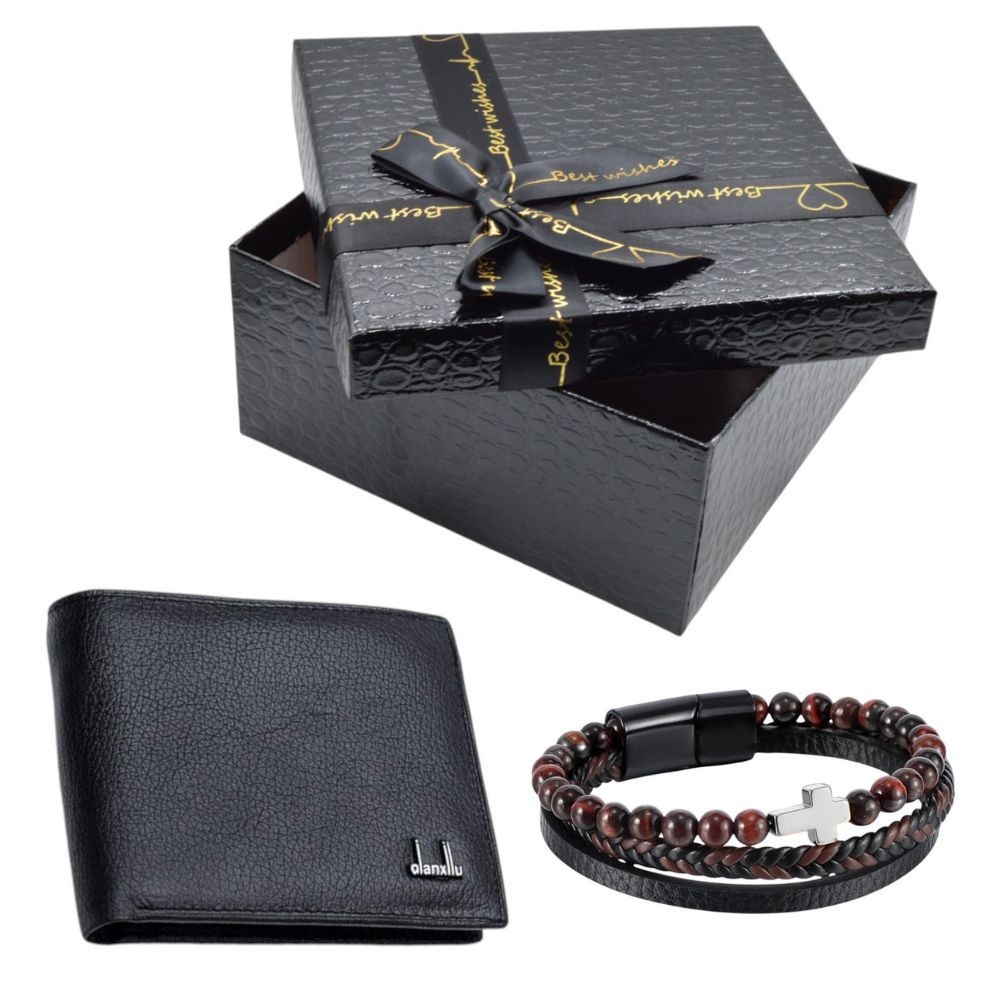 Set cadou portofel piele naturala, bratara cu cruciulita, cutie
