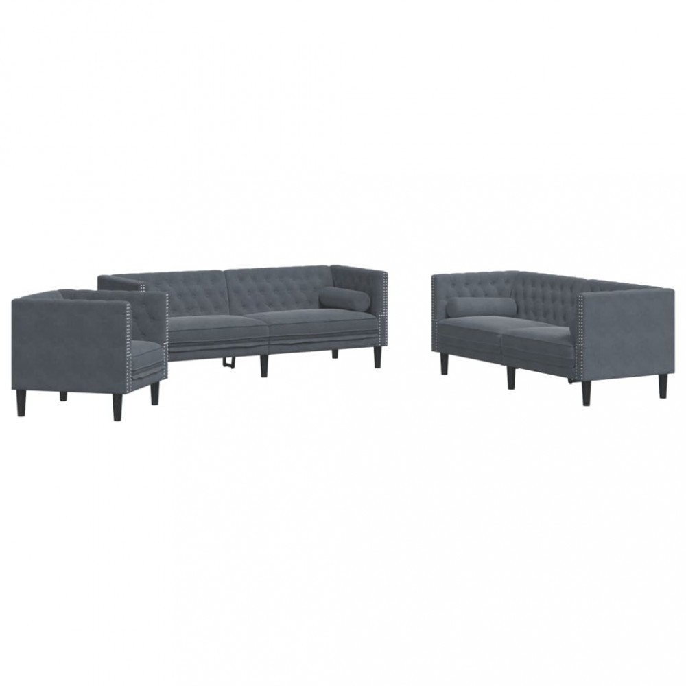 Set canapele Chesterfield cu perne rulou, 3 piese, gri, catifea