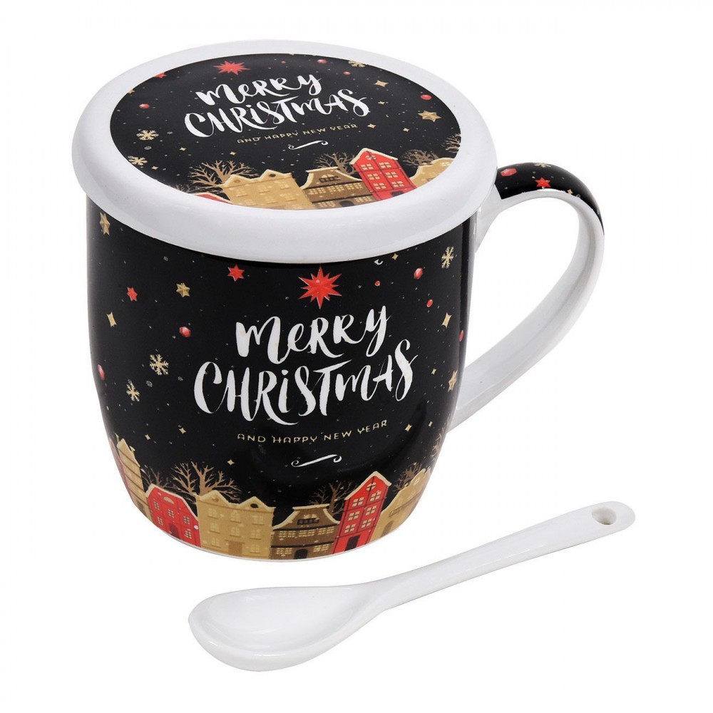 Set Cani Crăciun, Merry Christmas, Porțelan, Capac și Lingură, Negru, 3 Bucăți