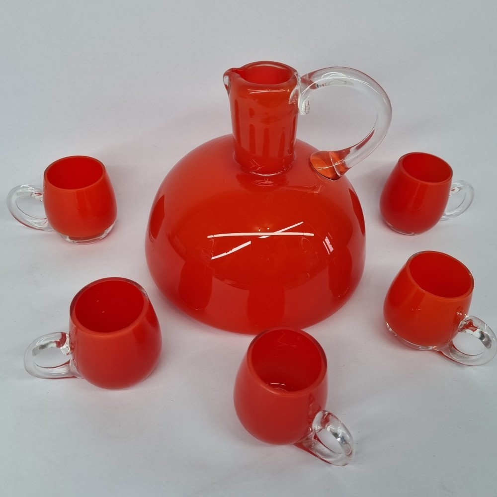 Set Carafa si 5 pahare (SET RAR) sticla MURANO, veche, vintage - starea care se vede, apreciere dupa poze - Decor, colectie - 4,5 cm inaltime paharele, 13,5 cm inaltime carafa