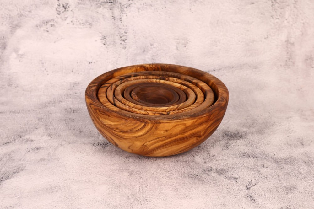 Set boluri format din 6 bucăți, realizat handmade din lemn de măslin. Ideal pentru servirea fructelor uscate și nu numai. Produsul are un grad mare de rezistență datorită lemnului din care este făcut, cu proprietăți antibacteriene naturale. Este uns cu un strat de ulei de măsline, fără substraturi chimice. Un produs cu adevărat special și util, atât pentru casa ta, cât și pentru un cadou deosebit.Dimensiuni: (L x l x h), D1 bol 18 x 18 x 8 cm, D15 cm1 bol 14 x 14 x 7 cm, D13 cm1 bol 12 x 12 x 5 cm, D11 cm1 bol 10 x 10 x 4 cm, D8 cm1 bol 8 x 8 x 3 cm, D6 cm1 bol 6 x 6 x 2 cm, D4 cmRecomandare:Nu este recomandată spălarea produsului în mașina de spălat vase.Pentru păstrarea aspectului și a texturii pentru un timp îndelungat, se va unge produsul din când în când cu puțin ulei.