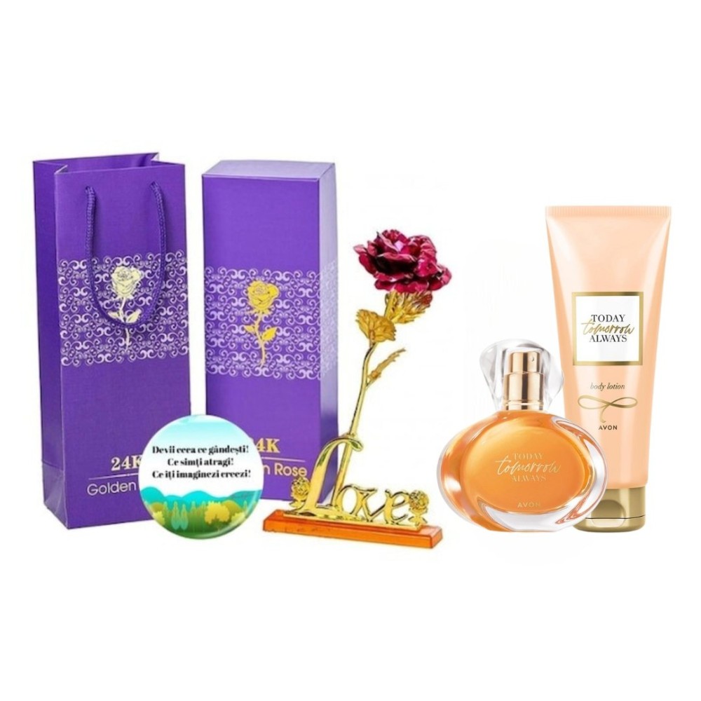 Set complet pentru Ea TTA Tomorrow (apa de parfum, lotiune de corp), insotit de insigna Dactylion cu mesaj motivational, cadou un trandafir rosu sufla