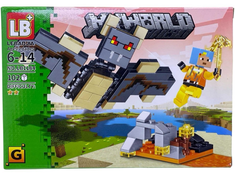 Set constructie Liliac Gigant si Aventura Minerului Set de 102 piese, cu un liliac construit din blocuri pixelate, un personaj echipat cu armura aurie si un mic decor de mina. Perfect pentru fanii explorarilor subterane si aventurilor in lumea pixelata.