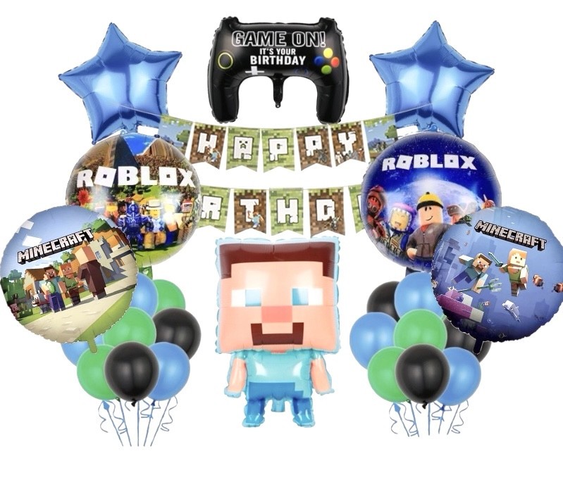 Set De 24 Baloane Figurine folie MineCraft 67 cm, Baloane Latex 30 cm,Folie rotunda 45 cm, stegulete decorative, Verde si Albastru