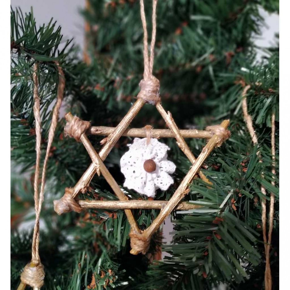 Set de 5 stele din lemn, handmade, pentru bradul de Craciun Ornamentele sunt realizate betisoare din lemn cu floare din dantela, ienibahar si snur de iuta. Dimensiuni aproximative:Diametru: 11 cm