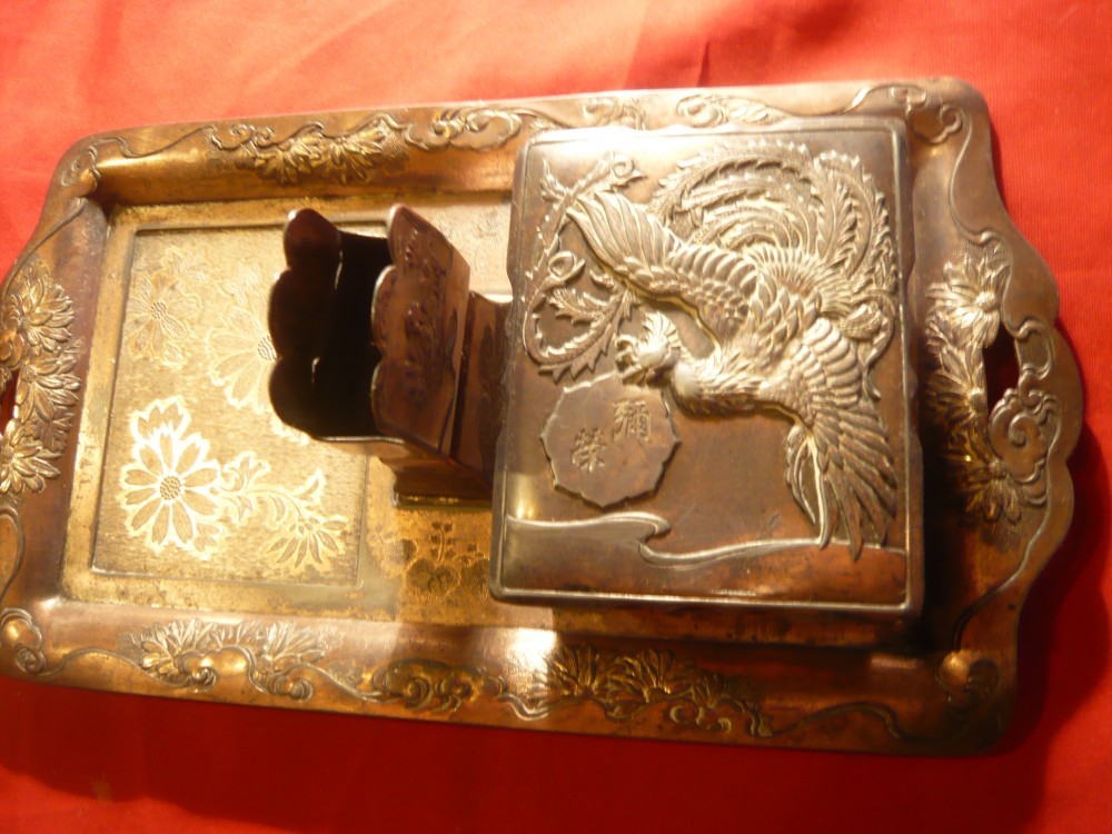 Set de birou pt fumat- Japonia- tavita ,cutie tutun cu capac , suport chibrit - metal alamit si argintat -ornamentat in relief cu motive japoneze