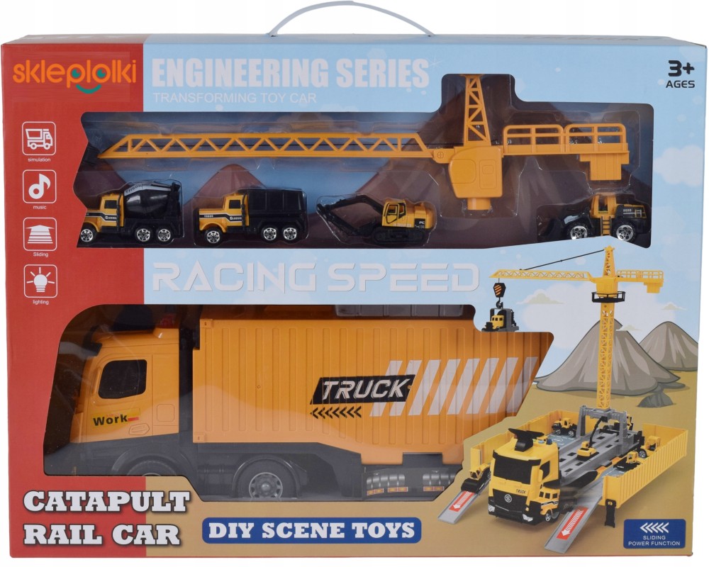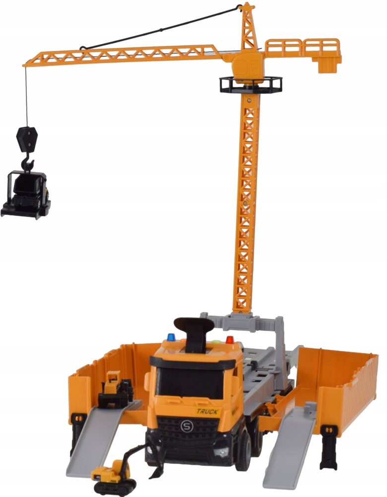 Setul include un camion mare și patru vehicule de construcții mai mici (metal + plastic), un lansator de vehicule și o macara mobilă cu o greutate metalică pentru transportul încărcăturilor. Detaliile realiste, culorile vii și manopera solidă asigură ore întregi de distracție creativă.
