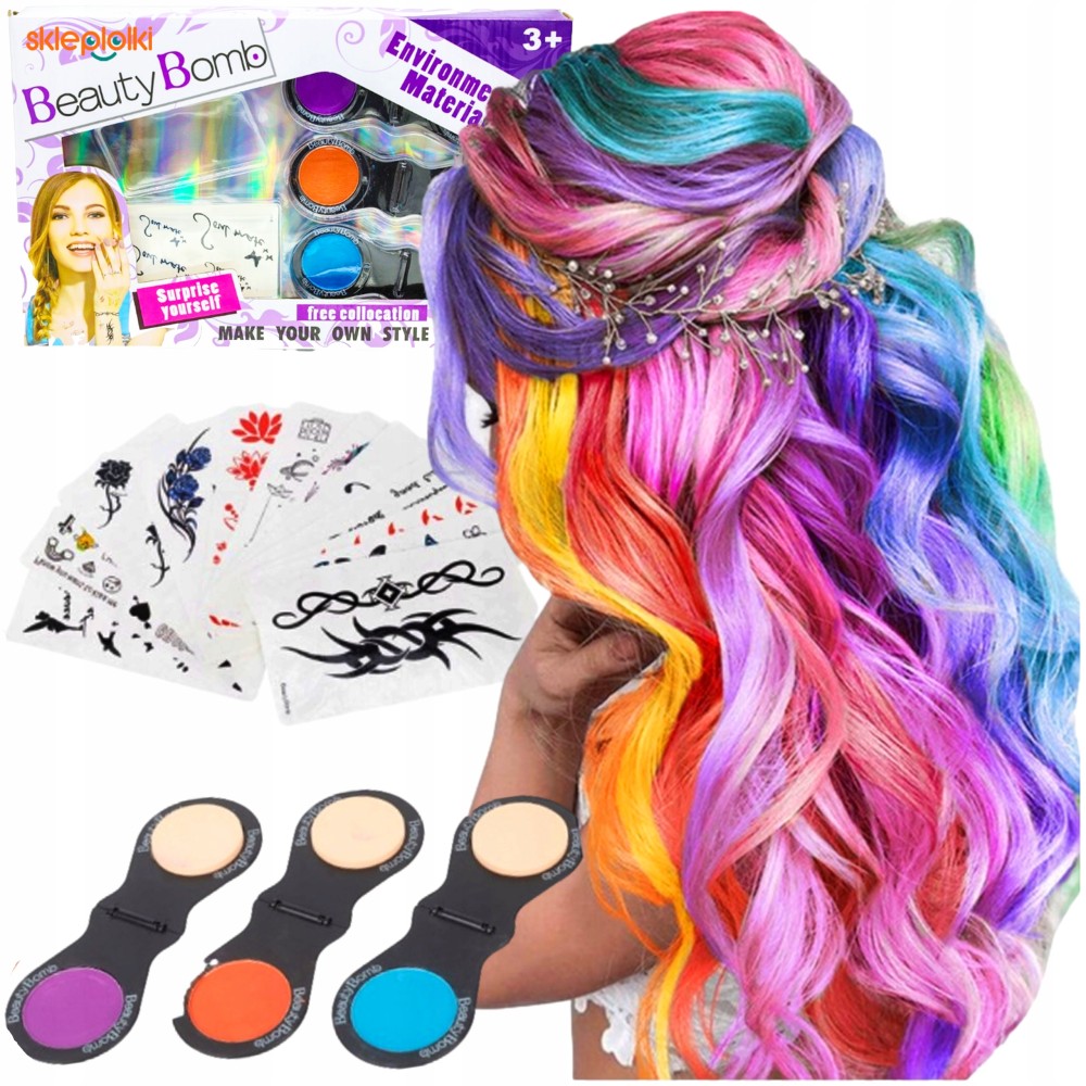 Set de creioane colorate pentru părul copiilor + foaie cu tatuaje lavabile