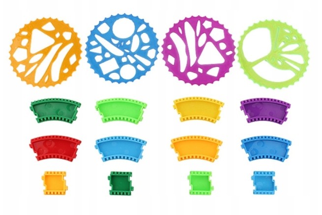 Copilul așează șablonul pe hârtie, introduce vârful stiloului în orificiu și îl rotește – creând astfel modele unice și colorate într-un mod simplu! Posibilitatea de a combina șabloanele oferă sute de combinații.
