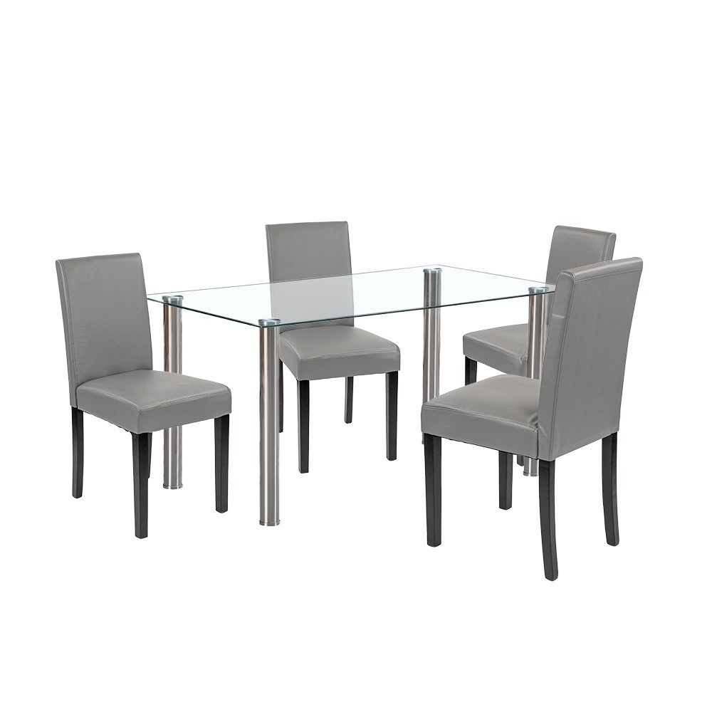 Setul include și patru scaune Leziter Kelly, tapițate cu piele ECO gri. Pe lângă aspectul elegant, aceste scaune sunt extrem de ușor de curățat. Șezutul din spumă cu grosimea de 4 cm oferă confort chiar și în timpul meselor mai lungi, iar picioarele stabile din lemn de pin, cu o capacitate de încărcare de 120 kg, garantează fiabilitate pe termen lung.