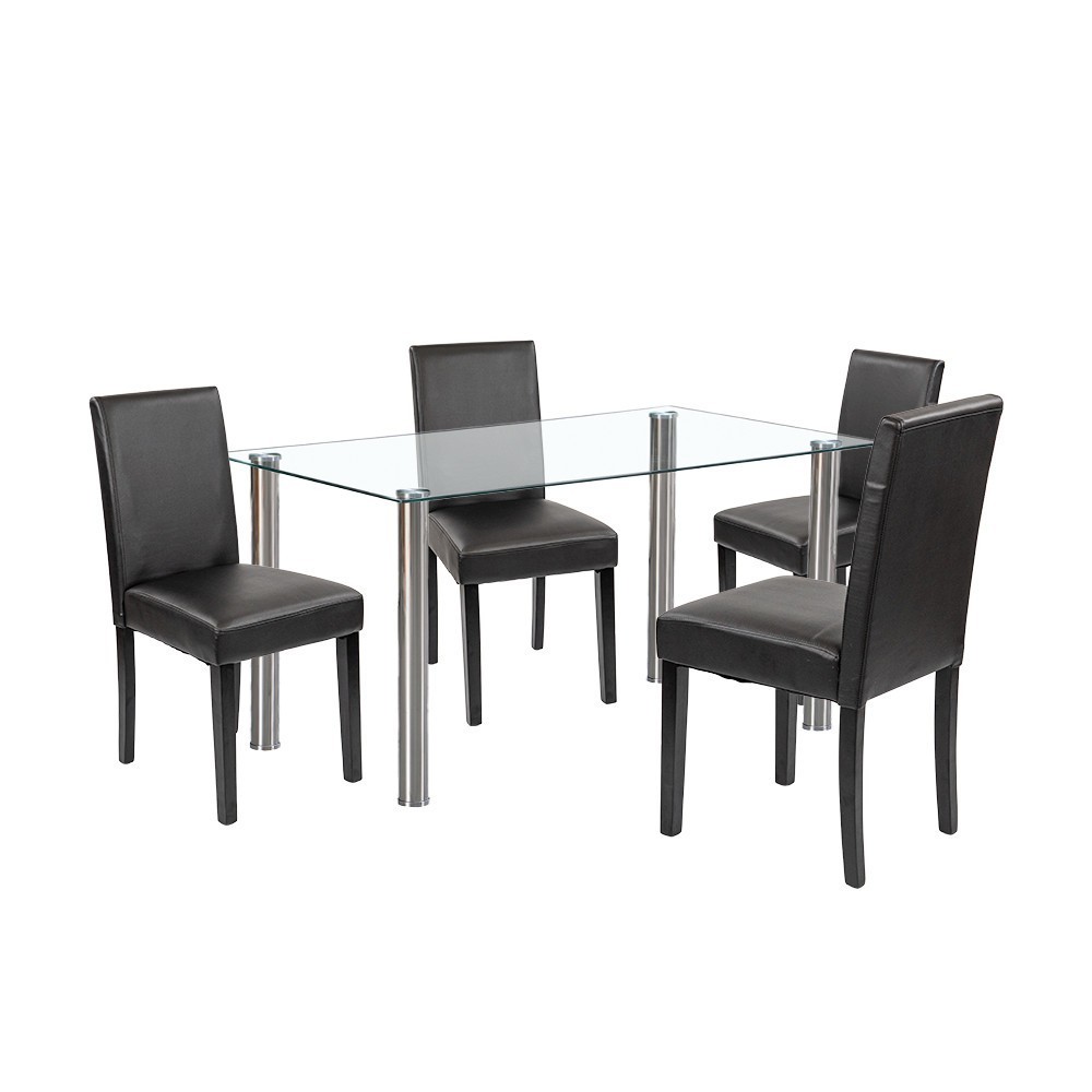 Setul include și patru scaune Leziter Kelly, tapițate în piele ECO neagră. Pe lângă aspectul elegant, aceste scaune sunt extrem de ușor de curățat. Șezutul din spumă cu grosimea de 4 cm oferă confort chiar și în timpul meselor mai lungi, iar picioarele stabile din lemn de pin, cu o capacitate de încărcare de 120 kg, garantează fiabilitate pe termen lung.