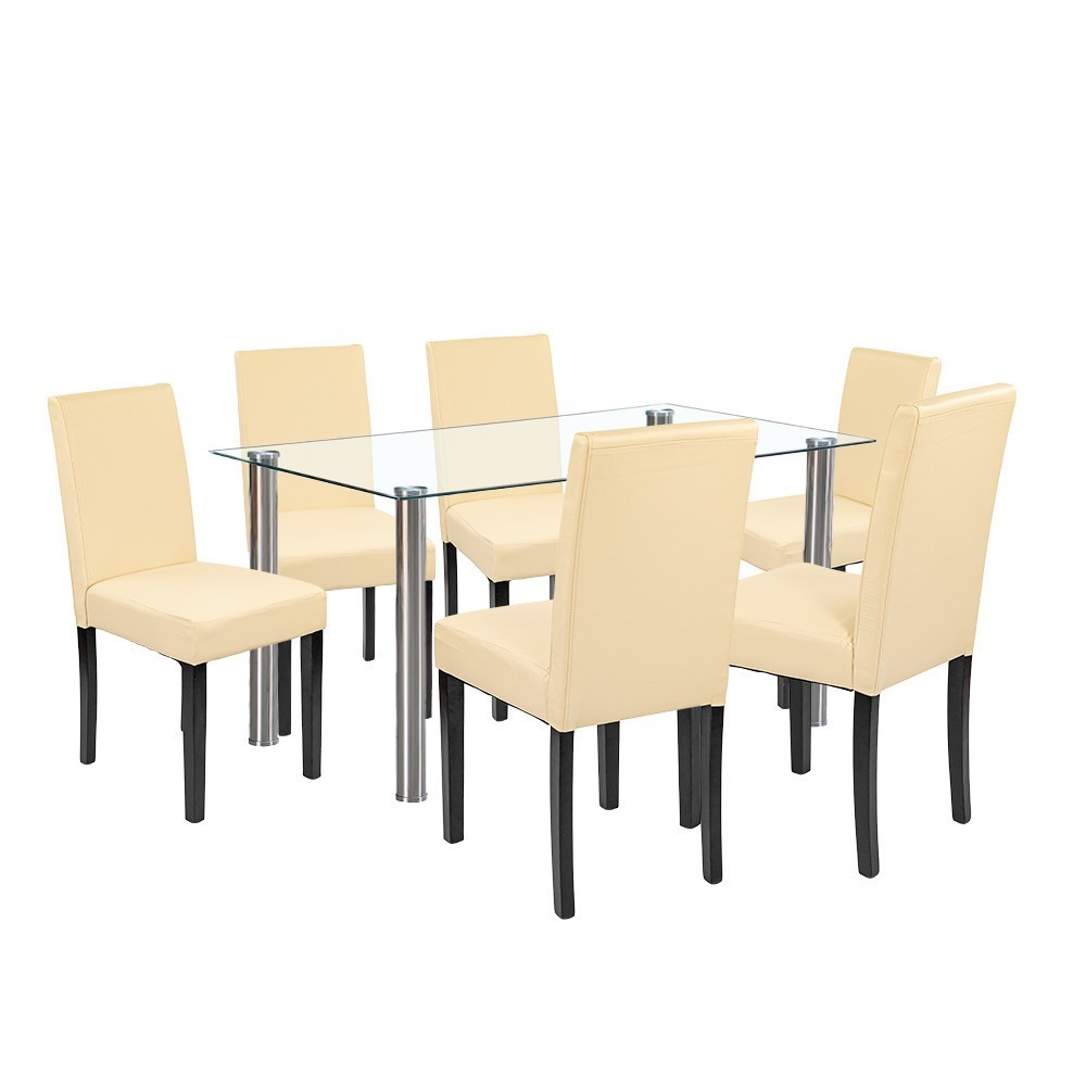 Setul include și șase scaune Leziter Kelly, tapițate cu piele ECO bej. Pe lângă aspectul elegant, aceste scaune sunt extrem de ușor de curățat. Șezutul din spumă cu grosimea de 4 cm oferă confort chiar și în timpul meselor mai lungi, iar picioarele stabile din lemn de pin, cu o capacitate de încărcare de 120 kg, garantează fiabilitate pe termen lung.