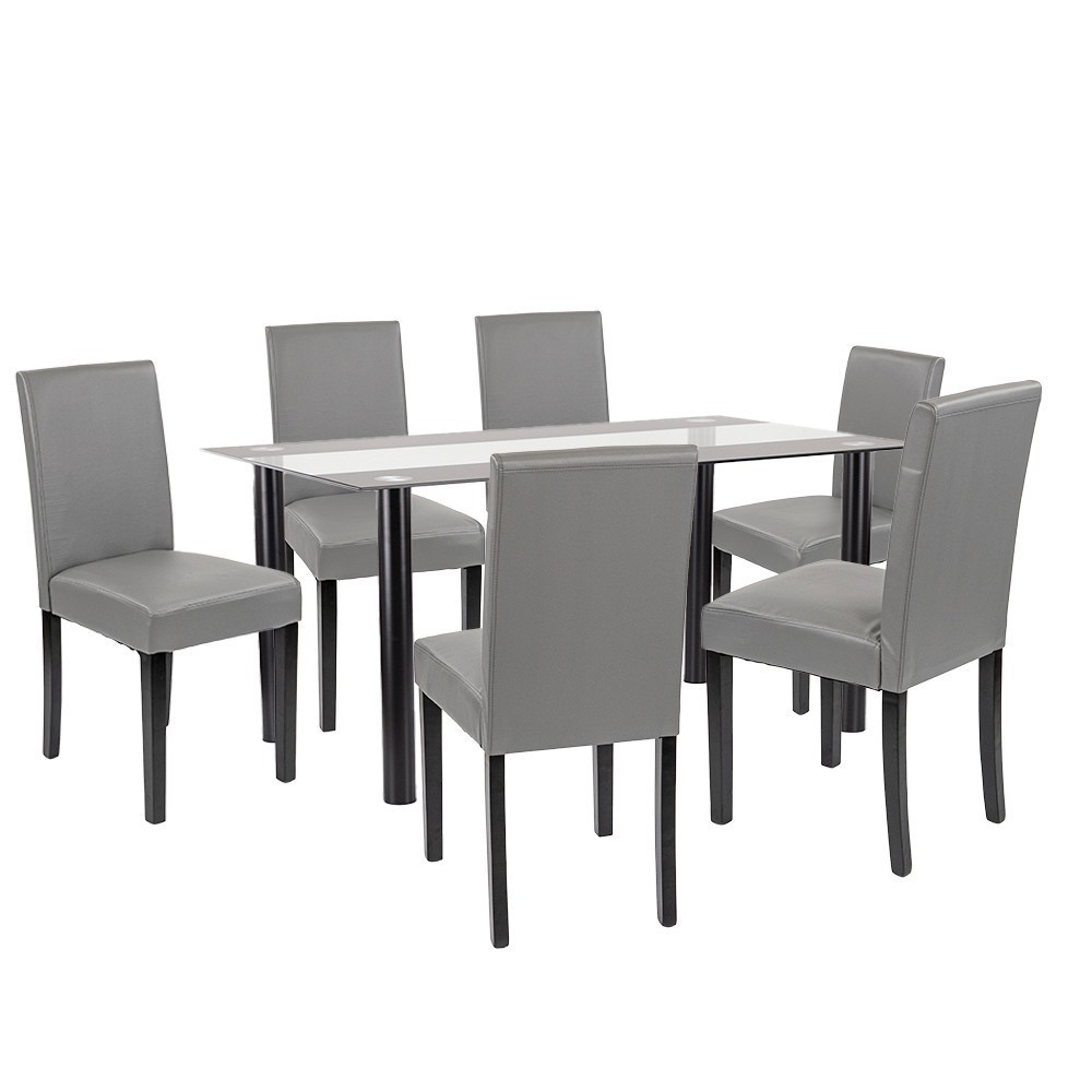 Setul include și șase scaune Leziter Kelly, tapițate cu piele ECO gri. Pe lângă aspectul elegant, aceste scaune sunt extrem de ușor de curățat. Șezutul din spumă cu grosimea de 4 cm oferă confort chiar și în timpul meselor mai lungi, iar picioarele stabile din lemn de pin, cu o capacitate de încărcare de 120 kg, garantează fiabilitate pe termen lung.