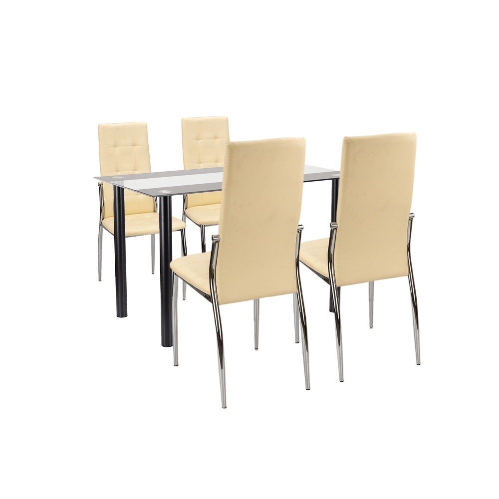 Setul de masă Lara 4 în 1, de culoare bej, este alegerea perfectă dacă doriți să creați un aspect modern și elegant pentru sufrageria sau bucătăria dumneavoastră. Setul este alcătuit dintr-o masă pătrată din sticlă Riona de 120 cm și patru scaune din lemn Aida , a căror combinație întruchipează claritatea, funcționalitatea și confortul.