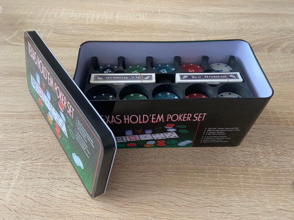Set de joc pentru poker nou , sigilat . Setul are 200 de jetoane cu valori cuprinse intre 1 si 25 , cu jetoane de Small Blind , Big Blind si Dealer . Insotit de un covoras de joc. In Bucuresti predare personala .