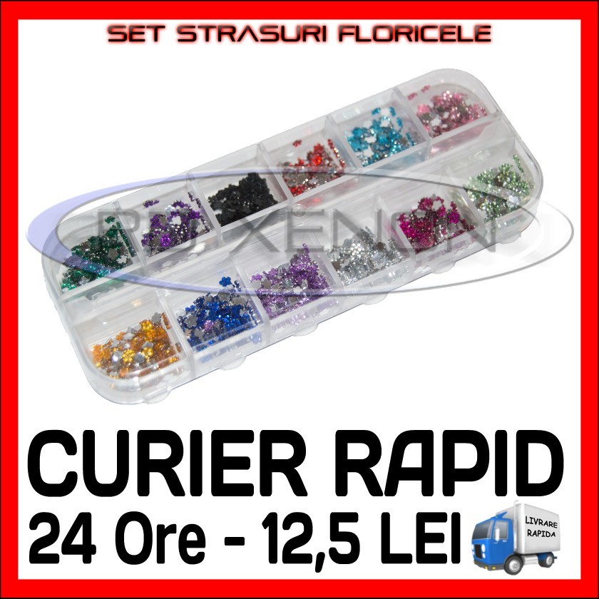 Setul contine 12 compartimente cu strasuri in forma de flori de