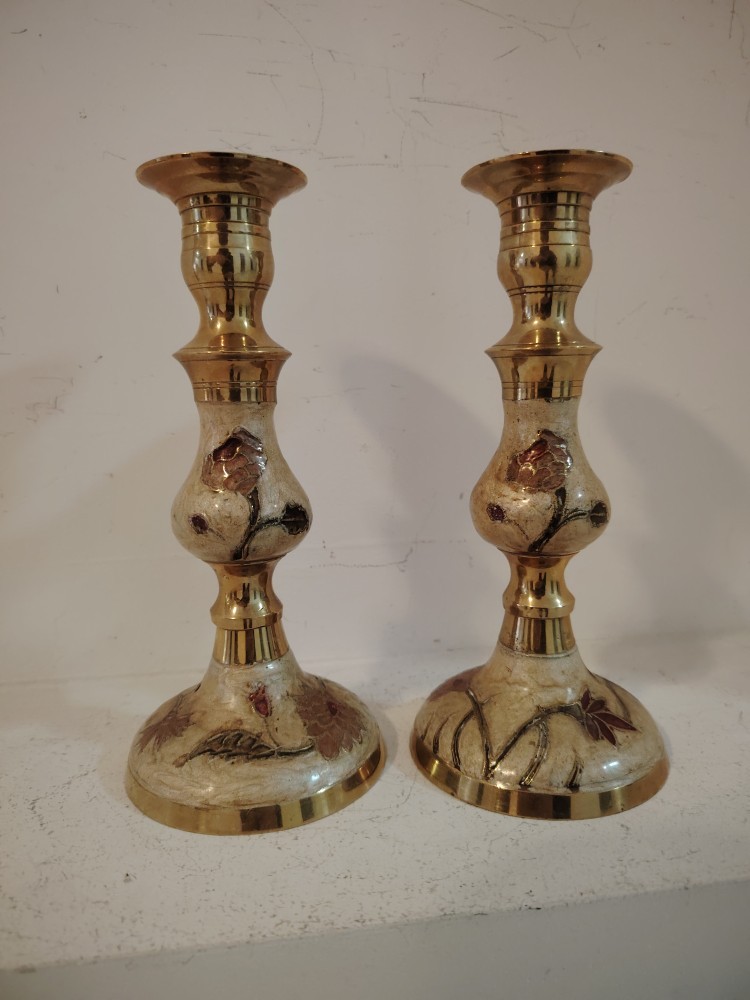 Set deosebit de 2 sfeșnice din alama masiva emailata ,model
