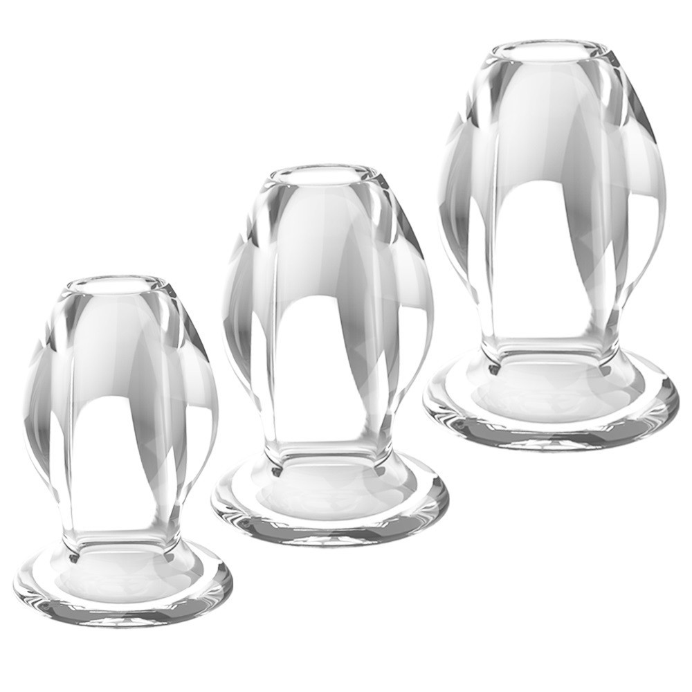Set format din 3 dildo-uri anale, de diferite dimensiuni, realizate din material neted si placut la atingere. Sunt create intr-un design unic si inovator, fiind transparente si goale pe dinauntru. Se pot folosi atat pentru cei incepatori in folosirea jucariilor anale, avand forma conica graduala si dimensiuni progresive, cat si pentru cei avansati. Mai exact, diametrul celui mai mic este de aproximativ 3 centimetri, iar cel mai mare ajunge la aproximatix 5 centimetri. Acest aspect ofera o utilizare confortabila, fara sa creeze vreun fel de disconfort sau neplacere. Totodata, dildo-urile pot fi folosite cu succes pe post de speculum, adica un obiect care mareste orificiul anal. Se pot manevra usor, avand fiecare o baza rotunda de care se pot tine in momentul utilizarii. Fiind goale pe interior, se permite a se insera in acea cavitate un glont vibrator, care sa ofere usoare senzatii de stimulare prin vibratiile care s-ar transmite intregului ansamblu. Glontul se poate achizitiona separat. Se recomanda utilizarea impreuna cu lubrifianti pe baza de apa si igienizarea produsului, inainte si dupa utilizare, cu solutii speciale pentru curatarea jucariilor erotice. Dimensiunile exacte se regasesc in imaginile alaturate. | Material: ABS | Lungime: 8 cm | Diametru: 2 cm | Culoare: Transparent