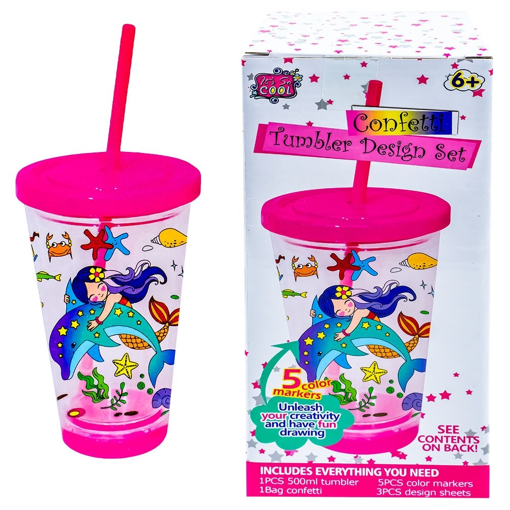– Setul super dragut ofera copiilor o experienta de desen cu rezultate deosebite, avand urmatorul continut: 1 pahar cu capac, 1 pai, 5 carioci, 3 folii din PVC, 1 punguta cu confetti.