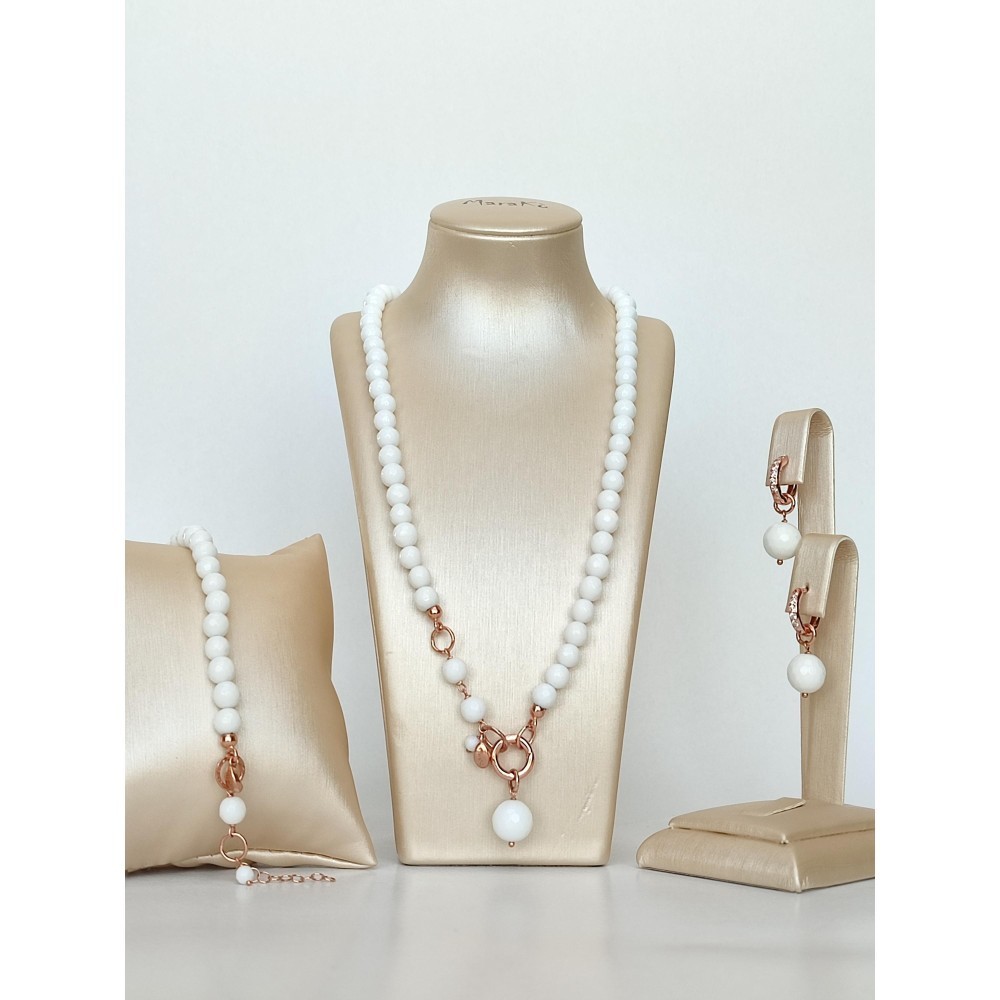 Set Energy din agat alb: colier, brățară și cercei. Colier din agat alb cu pandantiv detașabil; Detalii cu bucle de orfevrărie, inel strălucitor cu suprafață neregulată și logo-ul frunză Marakò, cu certificare pe spate. Poate fi conectat cu brățara pentru a forma un colier lung; Închizătoarea inelară din față îi permite să fie conectat la brățara, în mod invizibil. Lungime colier: aprox. 45 cm; Dimensiunea pietrei: 6 mm; Dimensiunea pandantivului: 10 mm; Brățară din agat alb; Dimensiune reglabilă: 17 - 23 cm. Se poate conecta cu colierul; Cercei inelari cu zirconiu cubic, argint placat cu aur roz și pandantive detașabile din agat alb, cu sfere de 10 mm; Se pot purta simpli sau cu pandantive. Detalii produs: Argint 925/°°° placat cu aur roz, cu tratament antioxidant unic. Certificat de garanție a materialului. Săculeț de catifea inclus. Fiecare bijuterie este realizată manual, cu precizia inconfundabilă Made in Italy. Notă: Culorile pietrelor semiprețioase pot diferi în funcție de reflexia luminii.