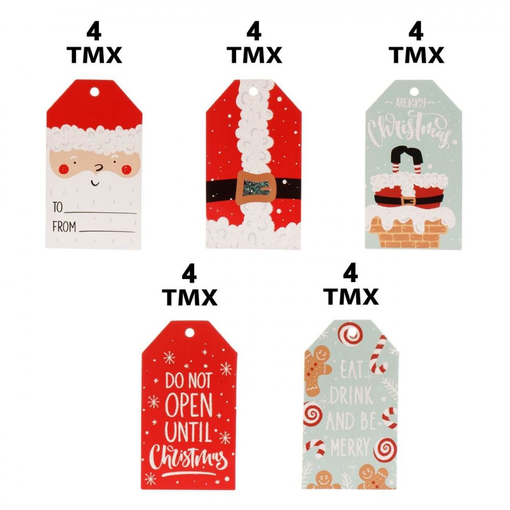 Set Etichete Cadouri Crăciun, 4 Modele, Glitter, Multicolor, 5x9 cm, 20 Bucăți, cu Panglici Roșii